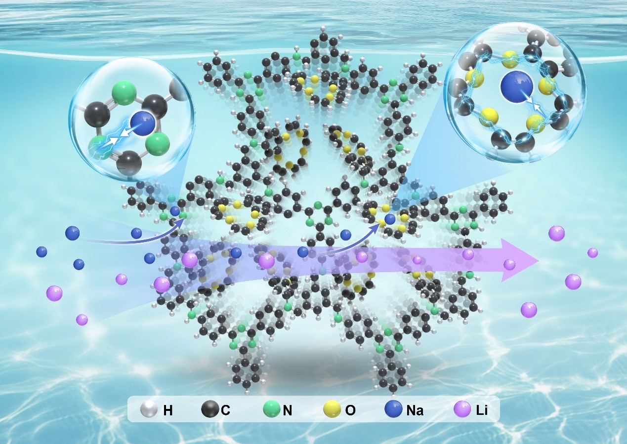 近日,青海盐湖所膜分离提锂技术与应用团队和电化学分离技术团队在Chemical Engineering Journal期刊上发表题为“Synergy of framework dynamics and crown ether chemistry in covalent organic frameworks for Na+ capture(共价有机框架中框架动力学与冠醚化学的协同效应助力钠离子捕获)”的研究进展,青海盐湖所博士生何小祥为论文第一作者,膜分离提锂技术与应用团队的朱朝梁副研究员、徐国旺博士和电化学分离技术团队的高丹丹研究员为共同通讯作者。在这项工作中,科研人员开发了一种新的柔性COFs的合成策略,在水溶液中通边搅拌单体90分钟内合成了ISL-COF-1和ISL-COF-2,并通过后合成修饰柔性COFs制备了4-溴苯并-15-冠-5功能化的COFs(ISL-COF-1CE/2CE)。表征结果表明,修饰后的COFs在保持高结晶度的同时,实现了15C5的有效固定。其中,ISL-COF-1CE展现出显著的Na⁺吸附性能(63.7 mg/g),优异的选择性吸附(Na⁺:41.4 mg/g vs Li⁺:5.8 mg/g)和循环稳定性(10次循环后效率>90%),证明了在Na⁺吸附方面的卓越性能。动力学和热力学分析表明,吸附过程符合伪二阶模型和朗格缪尔等温线,且为吸热自发反应。DFT计算揭示冠醚位点为主要结合位点,其次为三嗪N,而C–NH基团作用较弱。实验分析和理论计算表明,ISL-COF-1CE在Na⁺吸附方面的卓越性能源于冠醚配位、柔性框架、静电相互作用与亲水性增强的协同效应。该研究不仅阐明了冠醚-COFs中主-客体的相互作用机制,还为开发高效离子分离吸附剂提供了新策略。